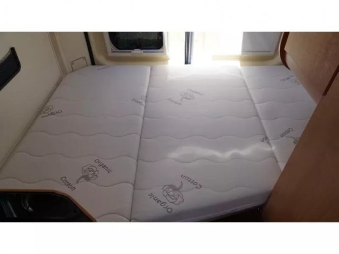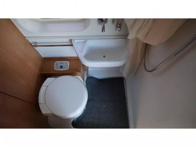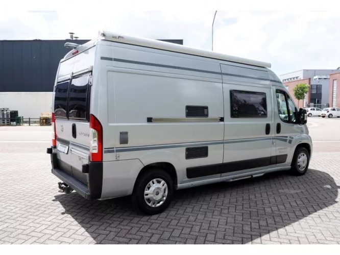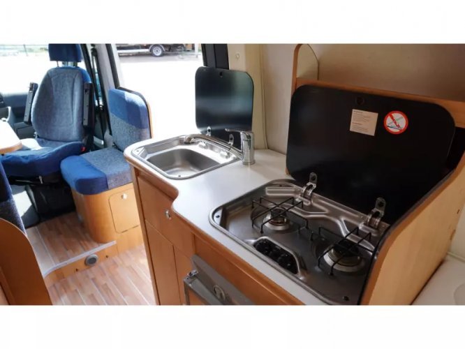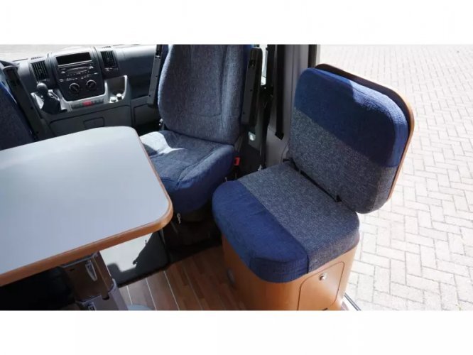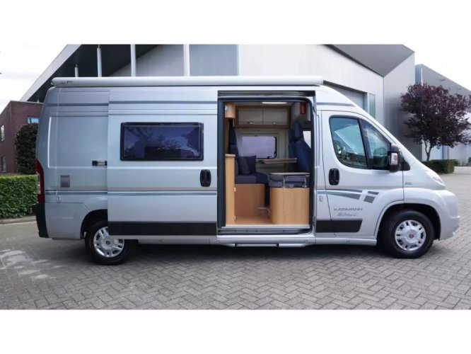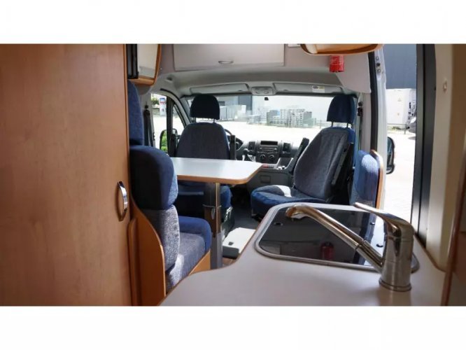 Este Karmann Davis 595 tiene una disposición especial. En la parte delantera vemos el asiento de serie donde los asientos delanteros son giratorios. En la entrada tenemos un pequeño banco que también se puede utilizar como mesa. En el centro de la caravana tenemos la cocina que está equipada con una estufa de 2 quemadores, fregadero y un frigorífico con congelador. Frente a la cocina se encuentra el cuarto húmedo, equipado con inodoro, lavabo y ducha. Este espacio es accesible a través de una puerta corredera para que haya suficiente espacio para caminar en la caravana. En la parte trasera de la camper tenemos la cama transversal para 2 personas. La calefacción está controlada por un calentador diesel Webasto. El agua caliente es controlada por una caldera de gas. La caravana está equipada con TV y satélite, pero no ha sido utilizada por el propietario durante mucho tiempo. El Karmann tiene un panel solar en el techo y en combinación con un inversor de 1200W es autosuficiente. Un toldo Fiamma proporciona el refugio necesario. Se pueden llevar bicicletas. Hay un portabicicletas disponible para la puerta trasera. Se trata de una caravana limpia y bien mantenida con signos de uso limitados, que son normales para esta edad.