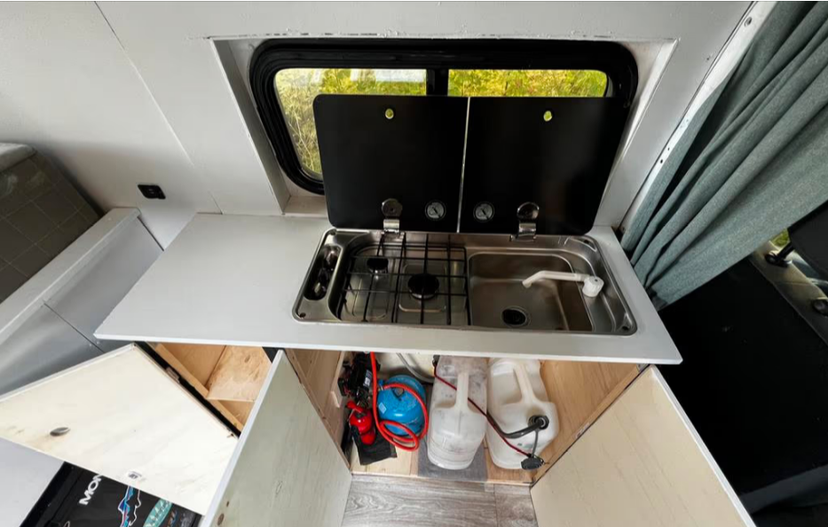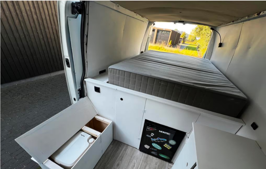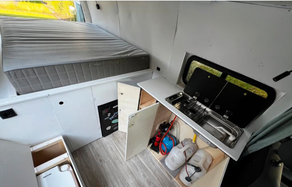 Precioso sencillo pero práctico 2 pers. Furgoneta camper. Completo con inventario. Con cocina a gas de 2 fuegos, fregadero con grifo, bomba de presión y tanque de aguas limpias y grises. Frigorífico de compresor de +5 a -18.