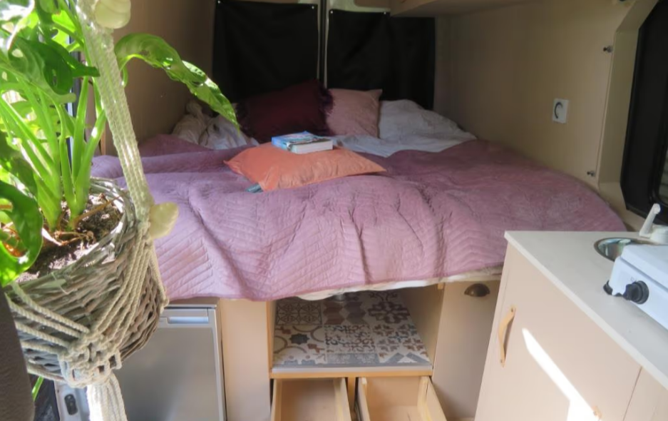 La cama es muy fácil de convertir en una acogedora zona de estar. También trabajamos mucho en línea durante nuestro viaje. Y con la mesa que puedes montar desde la cama en unos minutos, ¡esto no es problema! La cama es bastante grande para un autobús. Pensamos que dormir bien por la noche era importante, mi novio también mide 2 metros de altura. De ahí esta elección. La cama tiene un tamaño de 1,80 metros por 2 metros de largo.