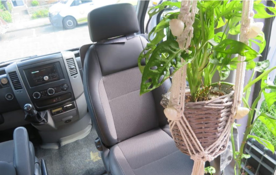 La caravana tiene sólidas sillas giratorias, las sillas se han retapizado para que parezcan nuevas. Hay un bonito espacio encima de ambos asientos para guardar cosas mientras se conduce.