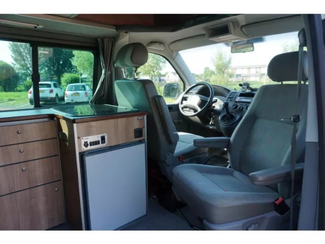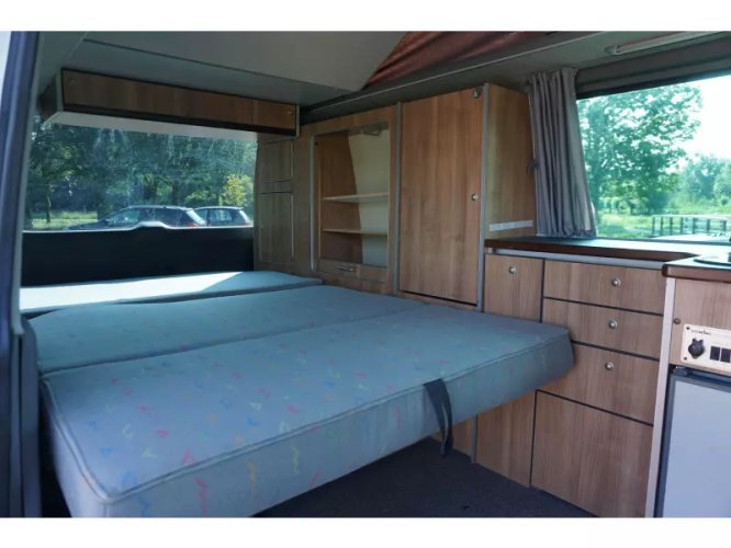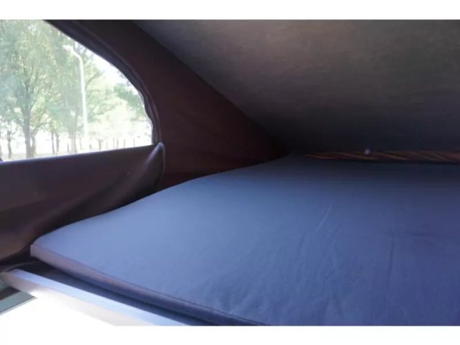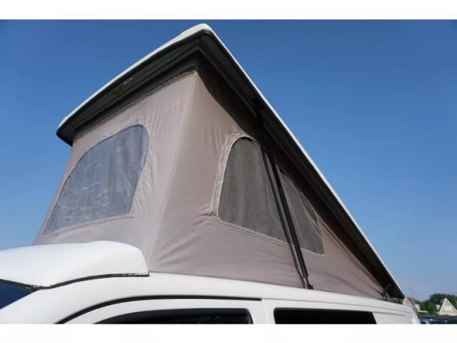 El centro de la cocina con nevera con congelador integrado tiene suficientes opciones de almacenamiento y está equipado, entre otras cosas, con un 2 quemadores de gas compatible con fregadero integrado. El autobús también está equipado con un depósito de agua limpia y dispone de aire acondicionado en el motor. El asiento trasero, junto con el banco del copiloto totalmente giratorio, ofrece la disposición deseada para los asientos del tren. Convirtiendo además el asiento trasero en una espaciosa cama doble (2×140) y las 200 plazas para dormir en el techo elevable (2×140), el autobús camper queda completamente completo para realizar maravillosos viajes de vacaciones.